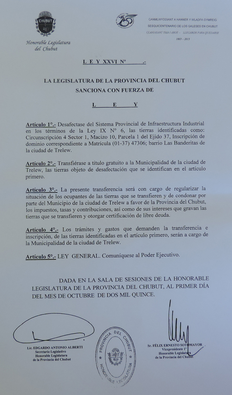 La Legislatura de la Provincia del Chubut convirtió en Ley el proyecto presentado por el gobernador Martín Buzzi mediante el cual se desafecta una porción de tierras del Sistema Provincial de Infraestructura Industrial, al sur del Parque Industrial de Trelew, donde se desarrolló un asentamiento de familias denominado barrio Banderitas.