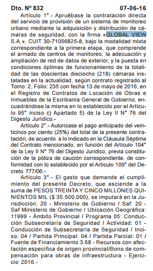 La gestión Das Neves se gastó $ 35.500.000 millones de pesos en 530 cámaras en el servicio de provisión del sistema de monitoreo urbano mediante adquisición y distribución de cámaras de seguridad, lo curioso es que la empresa “Global View” que contrató Ministerio de Gobierno directamente sin que haya licitación pública no dejo en funcionamiento el centro de monitoreo de Trelew, según fuentes Esquelenses esta contratación se realizó por expresas órdenes de Marivi Das Neves, Subsecretaria de Gestión Pública y Modernización del Estado