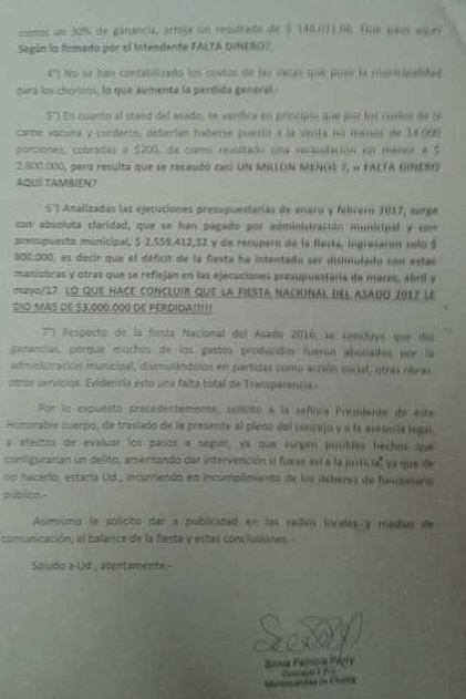 La nota ingresada por la Concejal del FPV Sonia Patricia Perry al Honorable Concejo Deliberante de Cholila con fecha 04/07/2017 traerá mucha polémica en Cholila y en Chubut porque una concejal solicita que la Justicia investigue qué pasó con el dinero de la Fiesta Popular de Chubut más importante.