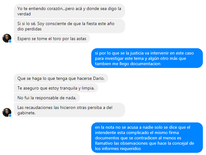 En otro tramo del diálogo en facebook Juana reconoce siendo consciente que la Fiesta del Asado dio pérdidas contradiciendo al Intendente Silvio Boudargham que en conferencia de prensa siendo acompañado por el Gobierno Provincial con bombos y platillos gracias a la pauta publicitaria del gobierno anunciaba que la Fiesta Nacional del Asado había dado una ganancia de $ 80.000 mil pesos y ahora el Pueblo reclama que faltan más de $ 3.000.000 millones de pesos.
