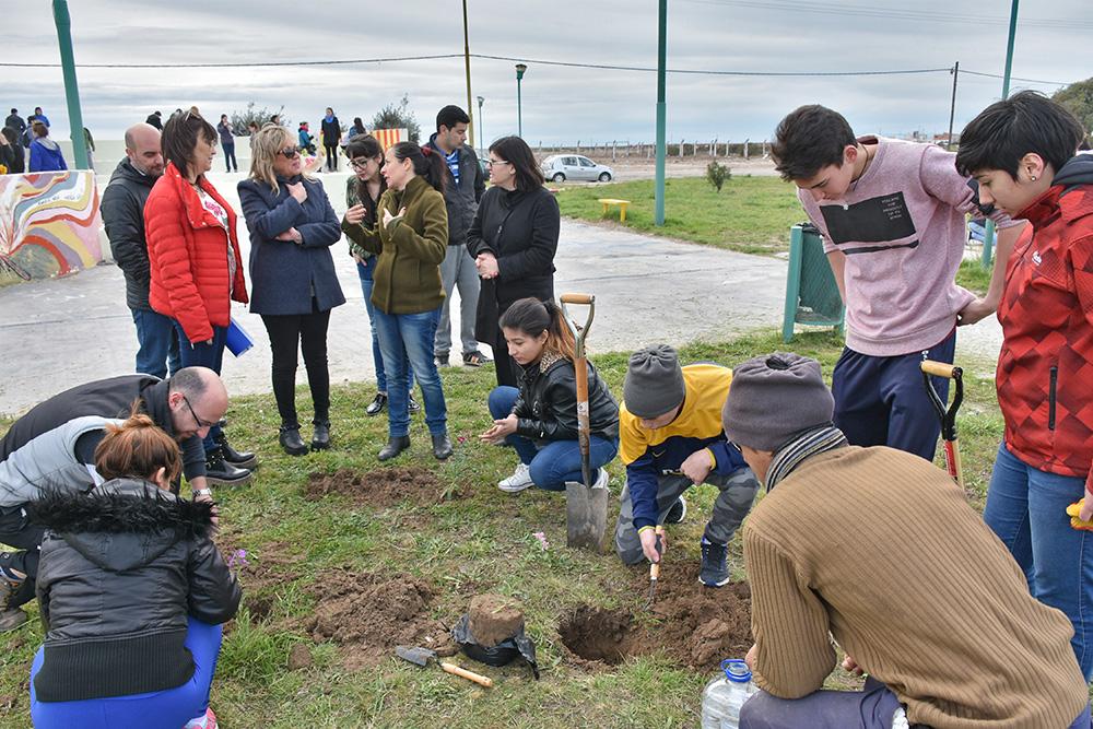 La intendenta Artero compartió la actividad. Es parte de un proyecto escolar que cuenta con apoyo de materiales y en asesoramiento por parte de la Secretaría de Producción y Medio Ambiente. Se trabajó en la Plaza España y en la Plaza de los Pueblos Originarios, en el barrio 490 Sur. Tendrá continuidad en otros espacios y se sumarán más escuelas.