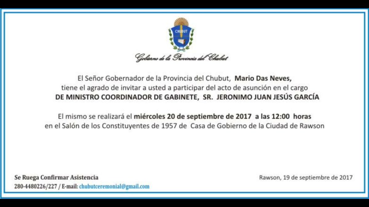 El gobernador Mario Das Neves le tomará juramento de ley a García como nuevo ministro Coordinador este miércoles a las 12 en Rawson, informó el Gobierno este martes por la noche a través de un comunicado de prensa.