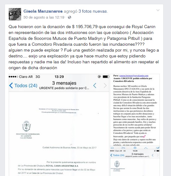 “Qué hicieron con la donación de $ 195.706,79 que conseguí de Royal Canin en representación de las dos instituciones con las que colaboro ( Asociación Española de Socorros Mutuos de Puerto Madryn y Patagonia Pitbull ) para que fuera a Comodoro Rivadavia cuando fueron las inundaciones???? alguien me puede explicar ? Fué una gestión realizada por mi, y nunca llegó a destino…. exijo una explicación ya que hace mucho que estoy pidiendo respuestas y nadie me las da! Incluso han repartido el alimento sin respetar el origen de dicha donación” denunció la vecina Gisela Manzanares.