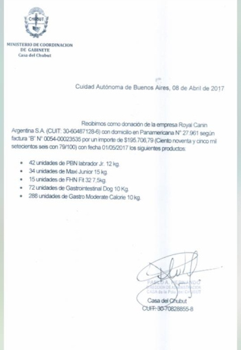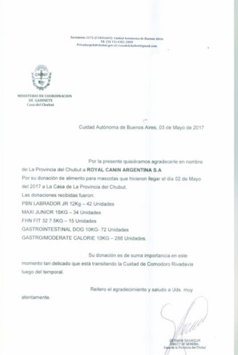 La empresa donó 491 bolsas de alimento con un valor de venta al público superior al medio millón de pesos que se entregó en La Casa del Chubut de Buenos Aires la cual fue agradecida en una nota por Germán Sahagun, Director Genera Casa de la Provincia del Chubut.