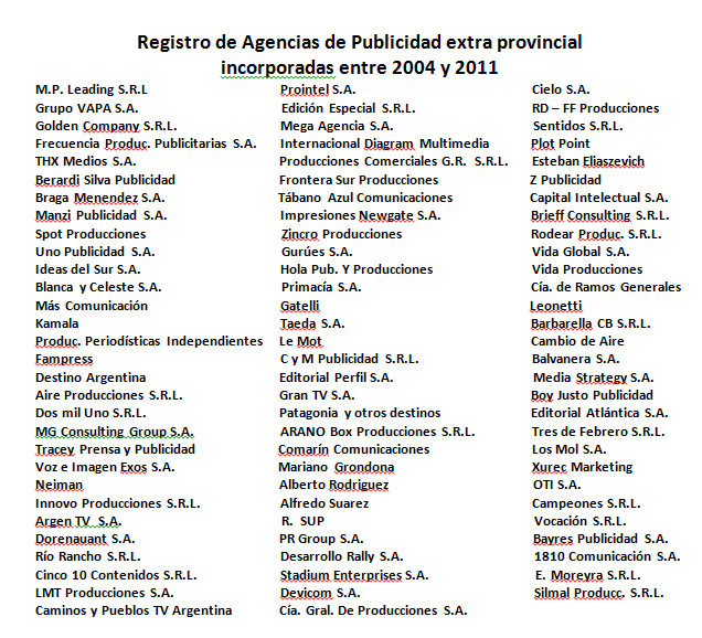 Entre las ochenta empresas incorporadas al Registro de Agencias de Publicidad figuran: Ideas del Sur S.A. – Marcelo Tinelli, Vida Producciones – Daniel Hadad, Braga Menendez S.A., Hola Producciones – Juan Mateiko, Esteban Eliaszevich, Balbanera S.A. – Federico Gelblung, Mariano Grondona, Dorenauant S.A. – Nelson Castro, y 1810 Comunicación S.A. cuyo titular es Enrique Gustavo Valenzuela Linage.