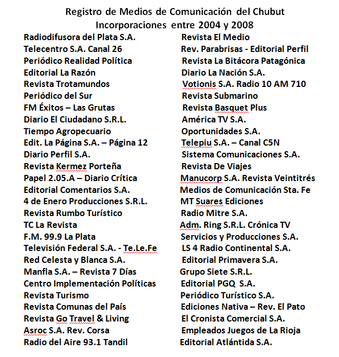 Cincuenta y cuatro medios de comunicación social y ochenta agencias de publicidad, todos extra provinciales se inscribieron en Chubut entre el 2004 y 2011.
