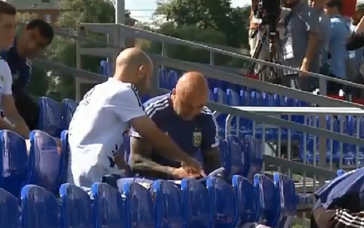 Una imagen que podría ser considerada como normal, en un entrenamiento deportivo, llamó la atención en el marco del tenso clima que invade a la selección argentina en la previa del partido con Nigeria.