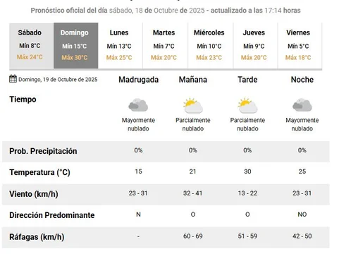 El SMN informó que durante la mañana se prevén ráfagas de hasta 69 km/h, descendiendo a 59 km/h por la tarde y a 50 km/h durante la noche. A pesar del viento, las altas temperaturas y el sol garantizarán una jornada agradable en la región.