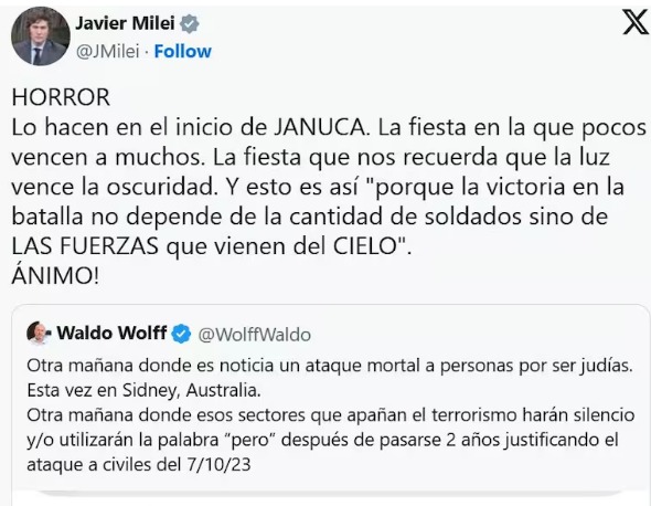 El mandatario utilizó su cuenta oficial para referirse al suceso, que coincidió con el inicio de la festividad judía: “HORROR. Lo hacen en el inicio de JANUCA. La fiesta en la que pocos vencen a muchos. La fiesta que nos recuerda que la luz vence la oscuridad. Y esto es así ‘porque la victoria en la batalla no depende de la cantidad de soldados sino de LAS FUERZAS que vienen del CIELO’. ÁNIMO!”.
