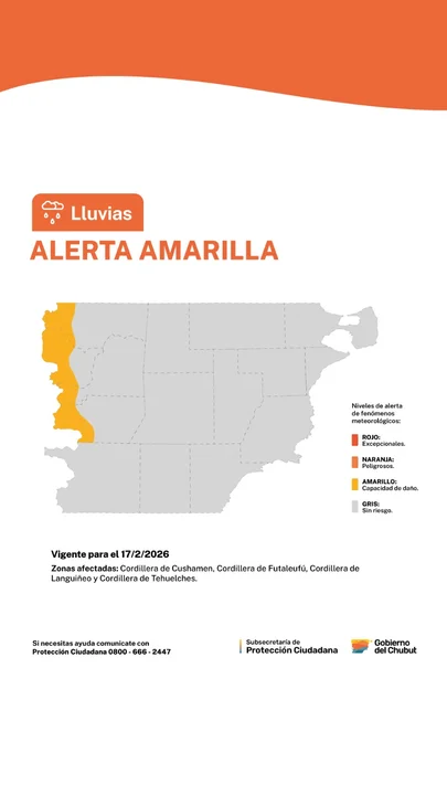 La región cordillerana de la provincia de Chubut se encuentra bajo vigilancia meteorológica ante la llegada de un frente de inestabilidad que afectará diversos departamentos durante las próximas horas. El Servicio Meteorológico Nacional (SMN) ha emitido una alerta de nivel amarillo para la madrugada de este martes 17 de febrero, previendo fenómenos que podrían alterar el desarrollo normal de las actividades y complicar la transitabilidad en los sectores más altos de la zona andina.