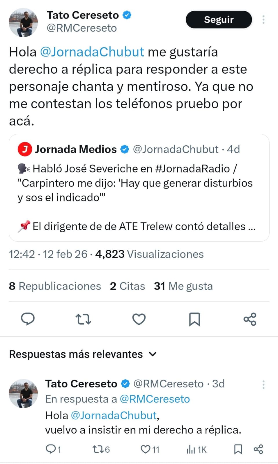 El ejercicio del periodismo conlleva una responsabilidad social que trasciende la simple emisión de información. En las últimas horas, los nombres de Tato Cereseto y Darío Fernández han vuelto al «pasquín de Jornada» del grupo Jornada integrado por el turco Jorge Aidar Bestene, el sindicalista Héctor Gonzalez, Walter García Moreno y el prestanombres Raúl «Bulín» Fernández no por sus actividades habituales, sino por la denuncia de una sistemática negativa por parte del periodista Esteban Gallo (Cadena Tiempo / Radio Jornada) a concederles el Derecho a Réplica luego de sus operaciones burdas y mentirosas.