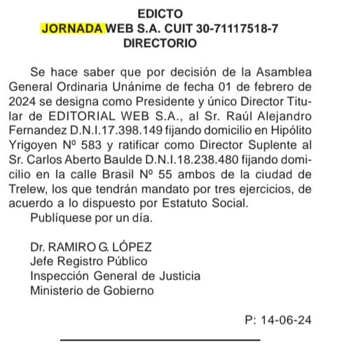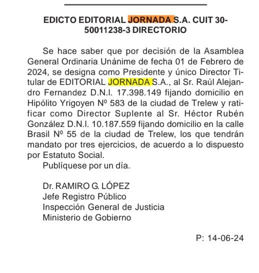 Se agrava la situación del Diario Jornada, el prestigio sigue en caída tras años y años de mal desempeño, primero se fundío con la editorial gráfica, pasaron a ser un portal de noticias y ahora paso a ser un simple pasquin de «operetas» tras sus reiterados rechazos de brindarle derecho a réplica al empresario pesquero Matías Raúl «Tato» Cereseto y al empresario de Medios Darío Fernández luego que se los calumniara e injuriara.