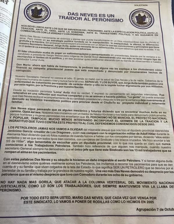 “Das Neves sigue pensando que es alguien mesiánico y futuriza diciendo que va encontrar muchos Ávila en su camino. Ojalá así sea. Nosotros nos cruzamos con un traidor de Néstor Kirchner y nos basta para denunciarlo públicamente, porque hombres y mujeres peronistas nos enseñaron que: el peronismo no se mancha. El proyecto nacional y popular, tampoco. Mucho menos intentando incorporar el germen de la traicion y la ingratitud que tuvo contra este proyecto al cual defendemos convencidos desde el 2003” dice la solicitada.