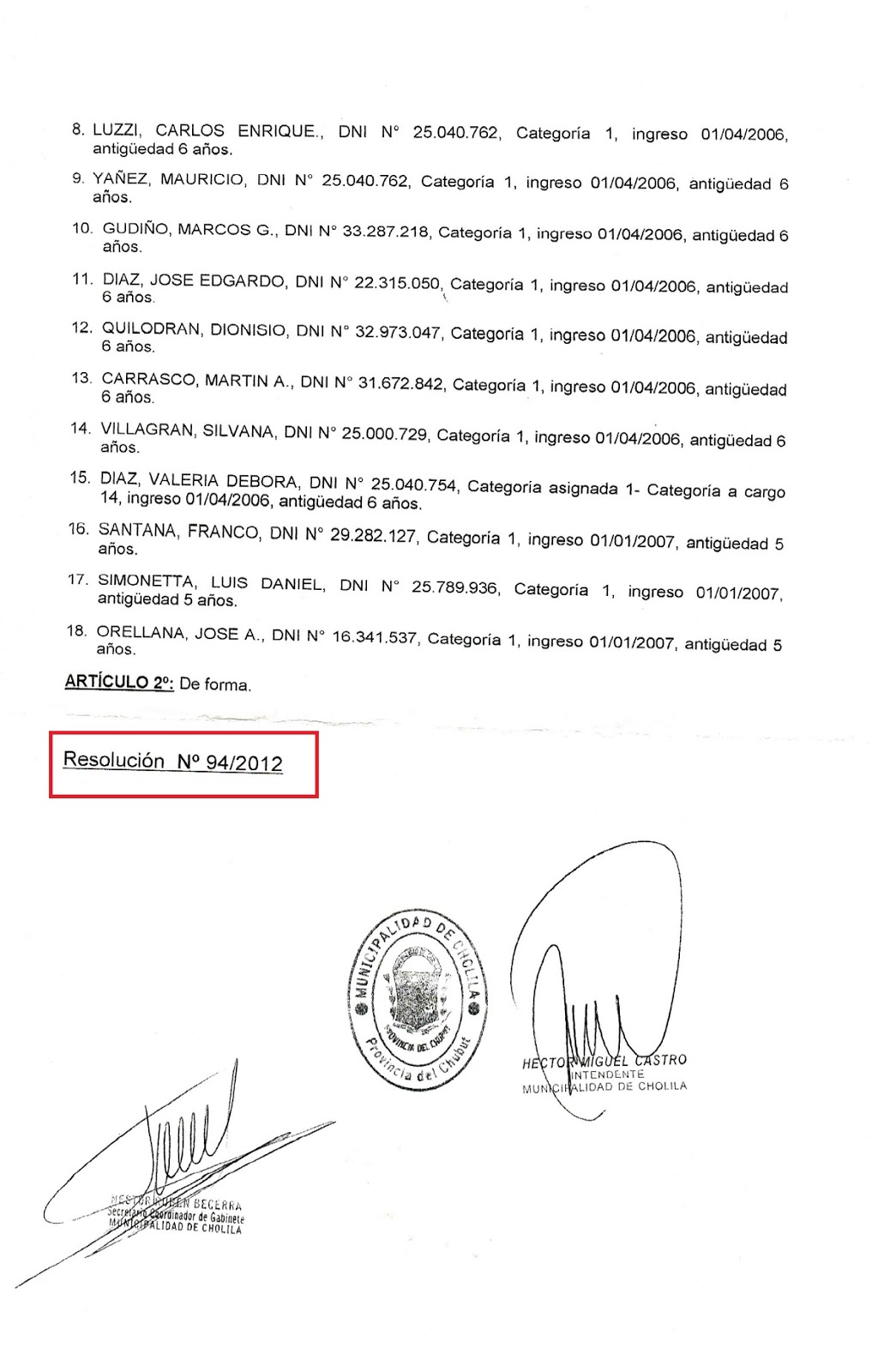 intendente Miguel Castro y su Secretario de Gobierno Rubén Becerra mediante la resolución n° 94/12.