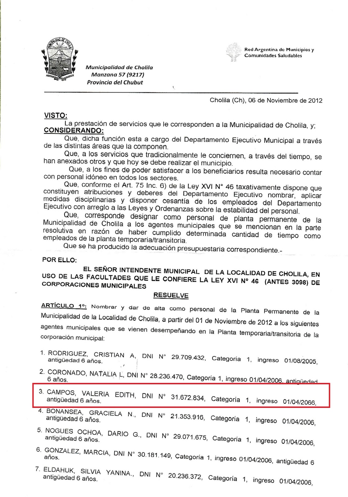 Campos, siendo concejal, fue pasada a planta permanente junto a otros funcionarios por el entonces