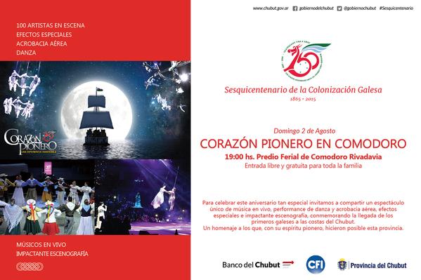 “Corazón Pionero” es un espectáculo producido y presentado a partir del apoyo brindado por las Secretarías de Cultura y de Turismo de la Provincia, que ya se realizó con gran éxito el lunes en Puerto Madryn, oportunidad en la que tuvo media hora de duración y contó con más de 80 artistas locales en escena que representaron el encuentro de las culturas galesa y originarias producido a partir del 28 de julio de 1865 con el arribo del velero “Mimosa” a las costas de Chubut.