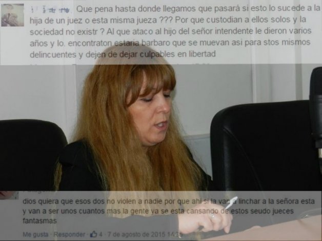 Además la magistrada, presentó una denuncia penal por «incitación a la violencia» a raíz de comentarios en la página de Facebook de una emisora radial y de un diario digital de la ciudad portuaria. «Hay que hacer mierda (sic) al Juez», escribieron algunos usuarios.