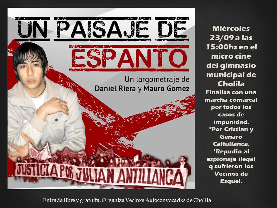 La reunión se realizó en el Microcine del Gimnasio Municipal de la localidad de Cholila, el día 23 de septiembre de 2015 a las 15.00 hs, en el lugar se proyectó la película documental “Un Paisaje de Espanto. El caso Antillanca y la Violencia Policial en Chubut”, sobre Julián Antillanca, joven de Trelew que fuera asesinado por efectivos de la Policía de la Provincia del Chubut cuando Miguel Castro era Ministro de Gobierno y Justicia del Gobierno de Mario Das Neves.
