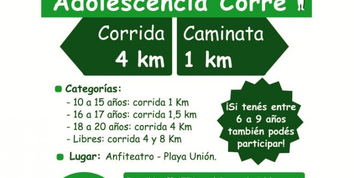 La actividad, organizada a través del Centro de Salud Integral del Adolescente de Rawson, se realizará el próximo sábado 26 de septiembre. Los interesados en participar podrán inscribirse en el anfiteatro del balneario capitalino hasta una hora antes de la corrida, que comenzará a las 15,30. Antes del sábado pueden hacerlo dirigiéndose al Centro de Adolescencia de Rawson, en Julio A. Roca N° 534, comunicándose al teléfono (0280) 4483549, al correo electrónicoadolescenciarw@gmail.com o al Facebook “Adolescencia Rawson”.
