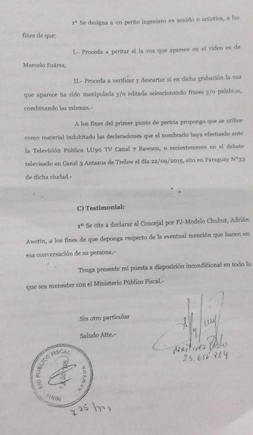 Martínez entregó a la fiscalía una copia del video que circula por las redes sociales y solicitó la designación del perito ingeniero en sonido o acústica para determinar si la vez que aparece es la de Marcelo Suárez y si el audio fue manipulado o editado seleccionando frases o palabras, combinando las mismas. A los fines de la pericia, propuso que se utilice como material indubitado las declaraciones que el nombrado realizó a Canal 7 o en el debate televisado por Canal 3 el 22 de septiembre pasado.