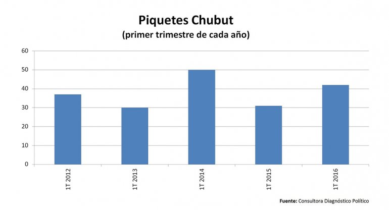 El relevamiento lo hace la consultora Diagnóstico Político todos los meses y en todas las provincias. En comparación con otros primeros trimestres del año, Chubut tuvo 37 piquetes en 2012, la consultora contó 30 en 2013 y 50 en 2014. Ese es hasta ahora el primer trimestre más conflictivo de los últimos cuatro años. En 2015 fueron 31 piquetes entre enero y marzo hasta llegar a los 42 de este año.