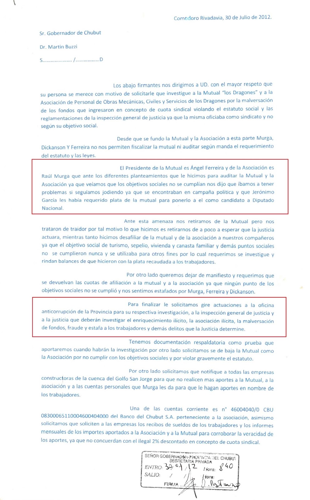 A continuación la denuncia de Daniel Ojeda el 30 de Julio de 2012 ante el Gobernador de Chubut manifestando que el Dasnevismo le pedía plata para la campaña política a los Dragones y solicitando se investigue a Jerónimo García. Dan números de cuentas bancarias.