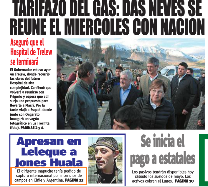 Estos dos medios movidos seguramente por el dinero de la caja publicitaria pretenden dejar a un simple mapuche que lucha por sus derechos en la posición de un delincuente peligroso, buscado a nivel internacional que lleva consigo un arsenal militar como si fuera “rambo” y va prendiendo fuego toda la Patagonia.