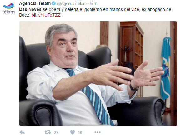 En seis meses del tercer mandato del Gobernador de Chubut, Télam nunca escribió en su contra, pero en este caso no lo hace en contra de Das Neves sino que le pega al Vicegobernador un golpe bajo que es lo que pretendería el “Monje Negro” para que se tape el escándalo de las Coimas PAE que lo preocupa tanto a Julio De Vido, Das Neves y Cía., con la detención de Hernán Arbizu y se hable así de Arcioni durante los 10 días que faltará Das Neves por su situación de salud.