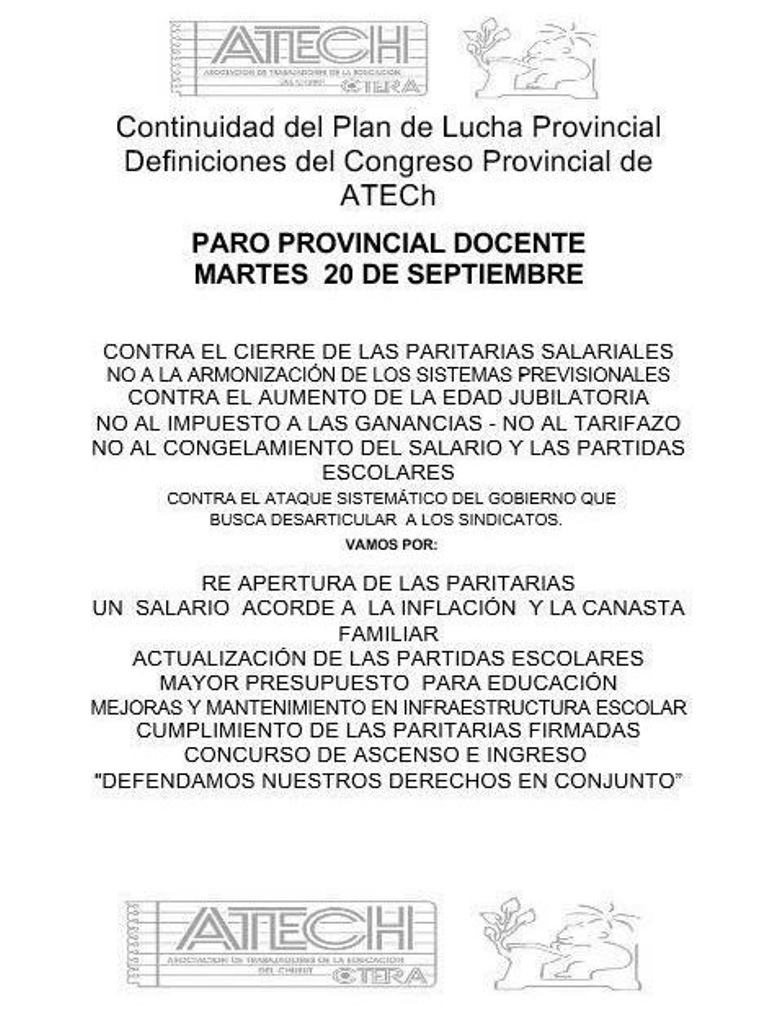 El secretario gremial de la Regional Sur de ATECh, Daniel Murphy, confirmó que mañana a las 11 se concentraran en San Martín y Alsina, en el marco del paro provincial convocado. “Estaremos con banderas y pancartas porque hasta el momentos no tenemos ninguna respuesta por parte de Provincia a todos los puntos que venimos reclamando desde hace mucho tiempo”, disparó el gremialista.