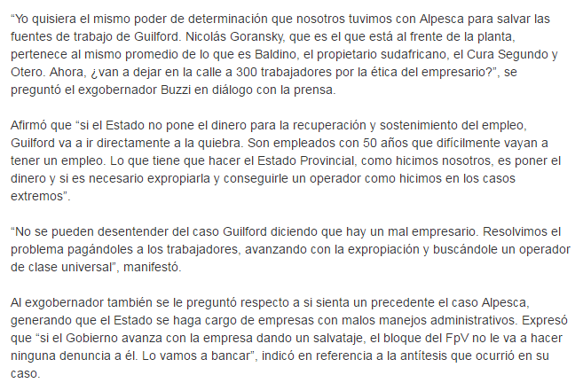 Das Neves volvió a criticar a los “gobernadores carancheros”, en relación a un mandatario provincial que estaría intentando llevarse la textil Guilford a su provincia. “No hacemos política partidaria con ningún conflicto. Vamos a seguir peleándola por Chubut, vamos a seguir peleando por los trabajadores de Guilford”, prometió.