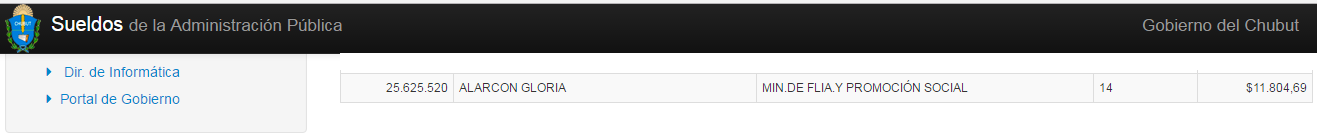 Gloria Alarcón en el Ministerio de Familia y Promoción Social actualmente funcionaria Municipal de Trevelin es Secretaria de desarrollo Social y Familia cobra $18.000.