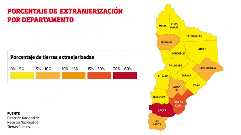 Neuquén.- Millonarios de distintas partes del mundo se están quedando con las porciones de tierra más cotizadas en la provincia de Neuquén, además de ser las que aportan los mayores recursos naturales y bellezas paisajísticas. Tal es el caso del departamento Lácar, donde entre un 30 y un 60 por ciento de estas superficies pertenecen a extranjeros, al igual que Collón Curá (15 al 30% del total) y Los Lagos, que registra entre un 10 y un 15%. Los números figuran en el último registro nacional de tierras rurales e involucra, en estos casos, a las zonas adyacentes a San Martín de los Andes, Villa La Angostura, Piedra del Águila, Villa Traful y Meliquina.