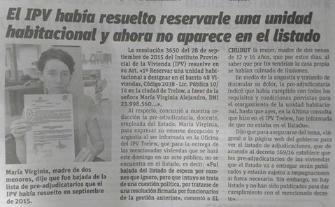 El IPV, a cargo de su presidente Alejandro Bertoriní en este gobierno dirigido por Marío Das Neves una vez más con su prepotencia y su abuso de poder se nos ríe en la cara. No solo jugaron con la ilusión de mis hijas de tener un techo propio sino que también se burlan de toda una sociedad: dicen una cosa y hacen otra. En el mes de Febrero de 2016 anunciaron con bombos y platillo el decreto N° 169/16 sobre el procedimiento de selección de postulantes y adjudicación de viviendas. El mismo fue y es ignorado por el IPV. Entre otras cosas el decreto estableció la obligatoriedad de publicar el domicilio actualizado y el puntaje total obtenido por cada postulante, que establece entre otros puntos anunciar el listado de los adjudicatarios. Cosa que no se hace, en especial en la entrega de las 48 viviendas sociales que se entregaran éste domingo (en ésta primera etapa solo se entregan 32 viviendas destinada a sus punteros políticos y obsecuentes de campaña).