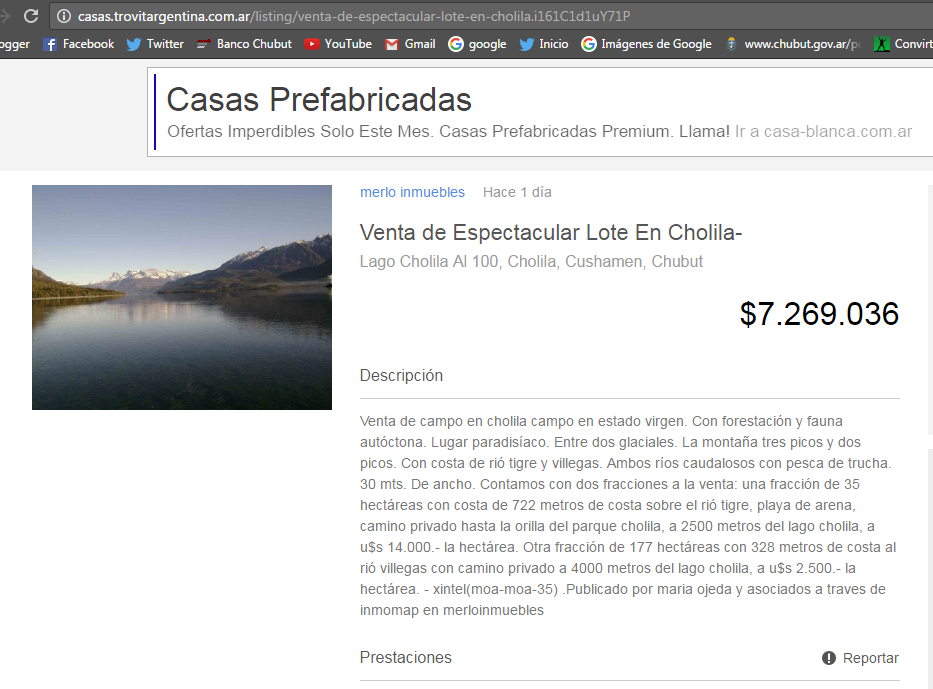 Ahora a la luz de todos y con total impunidad se vende un campo por 7.269.036 millones de pesos. Lo anecdótico es que el Gobierno del Chubut dice que va a enviar $ 9 millones de pesos para reforestar el bosque quemado que ahora por estas ventas está en manos de propiedad privada, para explicarlo mejor es como que el Estado le vaya hacer un jardín gratis a su casa. ¿A quiénes van a beneficiar con esos 9 millones de pesos?