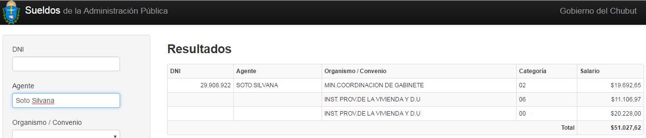 La secretaria de Marivi Das Neves es Silvana Soto que percibe salario mediante el Ministerio de Coordinación de Gabinete categoría 2 por la suma de $ 19.692, 65 y también cobra el sueldo del IPV compuesto por dos pagos uno de $ 11.106 y otro de $ 20.228 totalizando así entre los dos organismos unos $ 51.027 mil pesos superando al excelentísimo gobernador de la provincia del Chubut el cual ni enterado de lo que pasa en los organismos que dirigen sus súbditos.