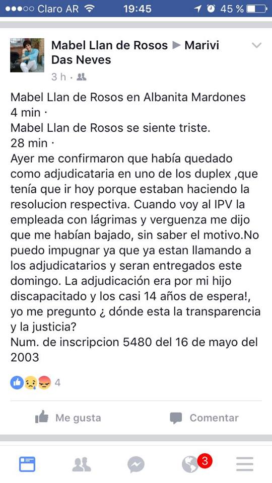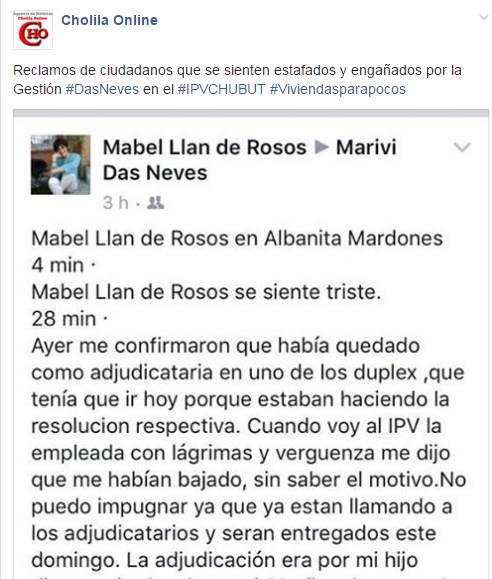 Mabel LLan de Rosos es un vecina de Chubut que publico en su cuenta de facebook como el IPV la quito de la lista de adjudicatarios expresó textualmente: