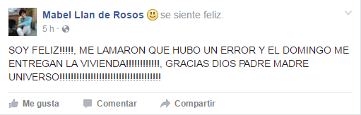 Luego de que Cholila Online publicará en facebook y twitter este reclamo que le hacían a la hija del Gobernador extrañamente y para sorpresa !o casualidad! llamaron a Mabel para comunicarle que el fin de semana le entregaban la vivienda.