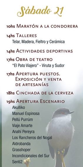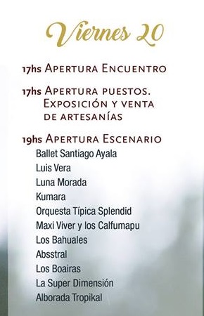 La Primera jornada comenzó con la apertura del encuentro, puestos, exposición y venta de artesanías a las 19:00 hs dio lugar a la presentación de artistas musicales estuvieron: Ballet Ayala, Luis Vera, Luna Morada, Kumara, Orquest Típica Splendid, Maxi Viver y los Calfumapu, Los Bahuales, Absstral, Los Boairas, La Super Dimensión y Alborada Tropical.