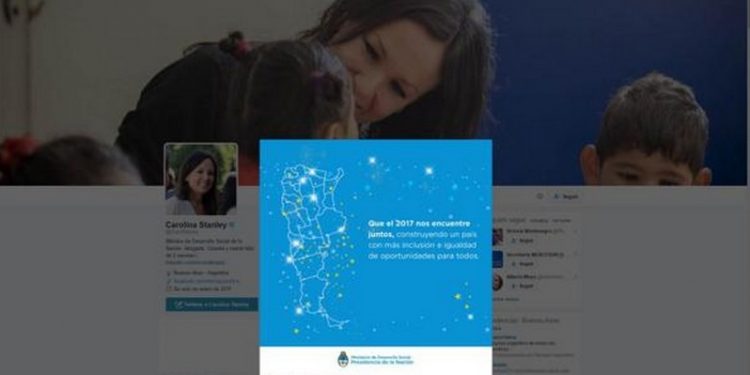 Tanto en la cuenta oficial de Twitter de la cartera, como en la de su titular, Carolina Stanley, escribieron: “Que el 2017 nos encuentre juntos, construyendo un país con más inclusión e igualdad de oportunidades para todos”. En la imagen se ve la eliminación de las Malvinas, las Islas del Atlántico Sur y la Antártida Argentina.