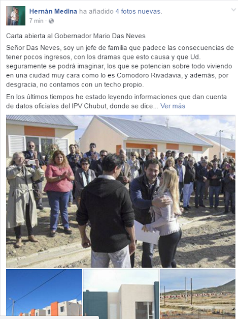 Señor Das Neves, soy un jefe de familia que padece las consecuencias de tener pocos ingresos, con los dramas que esto causa y que Ud. seguramente se podrá imaginar, los que se potencian sobre todo viviendo en una ciudad muy cara como lo es Comodoro Rivadavia, y además, por desgracia, no contamos con un techo propio.