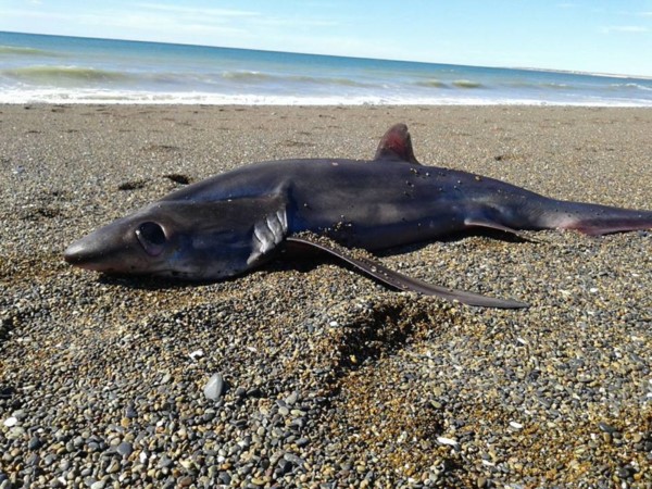 Las imágenes fueron subidas a Facebook por el reconocido guardavidas del balneario capitalino Mario Pereyra. El ejemplar quedó en la arena. Desde el Cenpat Conicet estiman que se trataría de un tiburón zorro, un especie extraña para estas costas.