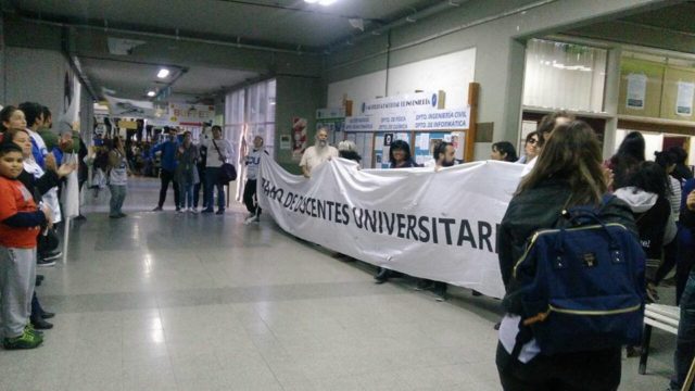 Durante la jornada de ayer docentes universitarios de la UNPSJB se movilizaron por las calles de Trelew en conjunto con los Centros de Estudiantes de Humanidades y Ciencias Sociales, Ciencias Económicas, Ciencias Naturales y Estudiantes Independientes de Derecho, y el Frente Estudiantil Awkache en adhesión a la marcha nacional por paritarias universitarias con salarios dignos.