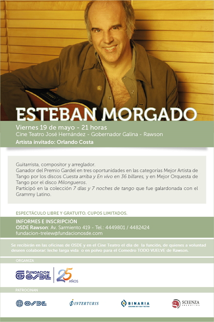 El reconocido guitarrista y compositor Esteban Morgado se presentará el próximo 19 de mayo en el Cine Teatro “José Hernández”, en una actividad organizada por la Fundación OSDE, en conjunto con la Municipalidad de Rawson, y que cuenta con entrada gratuita.