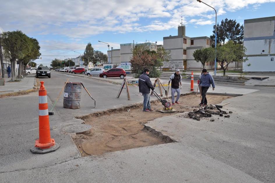 En el marco de los trabajos que realiza la Municipalidad de Rawson para mantener en condiciones los espacios públicos de la ciudad, personal dependiente de la Dirección General de Obras Públicas, dependiente de la Secretaría de Obras y Servicios Públicos, realiza tareas de reparación de pavimento dañado por la realización de una obra por parte de la Cooperativa en la calle Vucetich, en su intersección con San Martín.