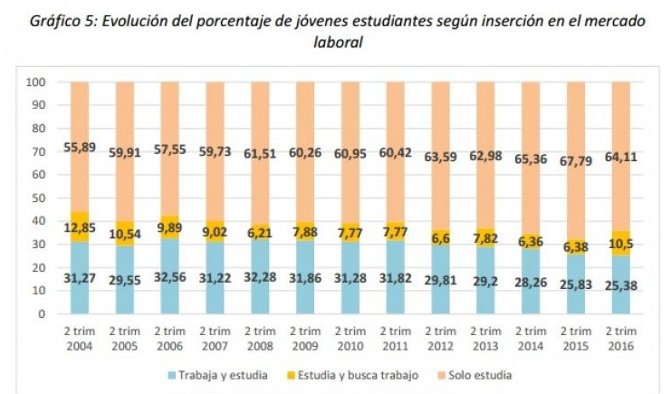 «Estas cifras van a contramano del proceso previo experimentado por los jóvenes. En el segundo trimestre de 2004 el desempleo juvenil se ubicó en 27,86% y se redujo sensiblemente a 17,12% para el segundo trimestre de 2008», destacó el informe y agregó: «La crisis de 2009 lo elevó a 19,94%, pero luego se evidencia una nueva reducción que ubica en un 17,86% a la tasa de desempleo juvenil en el año 2015. Es ostensible el salto a 23,63% en 2016, en línea con el aumento de la desocupación en el conjunto de los estratos etarios».