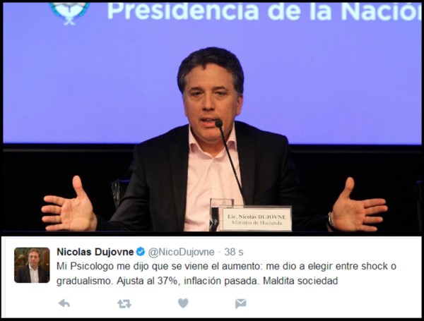 “Mi Psicólogo me dijo que se viene el aumento: me dio a elegir entre shock o gradualismo. Ajusta al 37%, inflación pasada. Maldita sociedad”, publicó la cuenta @NicoDujovne este jueves por la tarde.