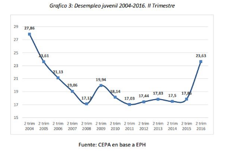 Estas cifras van a contramano del proceso previo experimentado por los jóvenes. En el segundo trimestre de 2004 el desempleo juvenil se ubicó en 27,86% y se redujo sensiblemente a 17,12% para el segundo trimestre de 2008. La crisis de 2009 lo elevó a 19,94%, pero luego se evidencia una nueva reducción que ubica en un 17,86% a la tasa de desempleo juvenil en el año 2015. Es ostensible el salto a 23,63% en 2016, en línea con el aumento de la desocupación en el conjunto de los estratos etarios