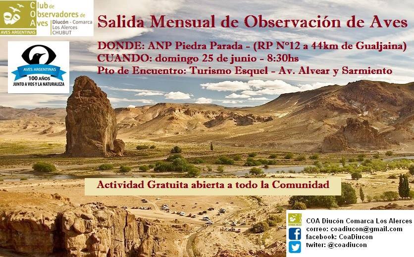 El próximo 25 de Junio el Club de Observadores de Aves Diucón Comarca de los Alerces viajará hasta Piedra Parada para realizar la habitual salida mensual.