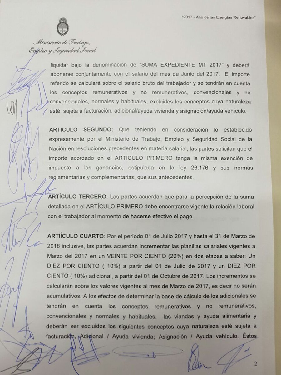 El incremento, logrado en las negociaciones de pauta salarial en el Ministerio de Trabajo de la Nación en Buenos Aires, señaló el dirigente que “no es un aumento salarial sino un ajuste sobre la inflación, que lo han firmado todos los gremios del país, se pagará un retroactivo del 10 % en suma fija más los porcentajes de aguinaldo para abril, mayo y junio, y a partir del 1° de julio el 10 % de aumento salarial y otro 10 % ratificado para el mes de octubre con una cláusula gatillo que no requiere discusión sino que irá por los porcentajes que se den de inflación, aumentándose automáticamente el salario del Trabajador”.