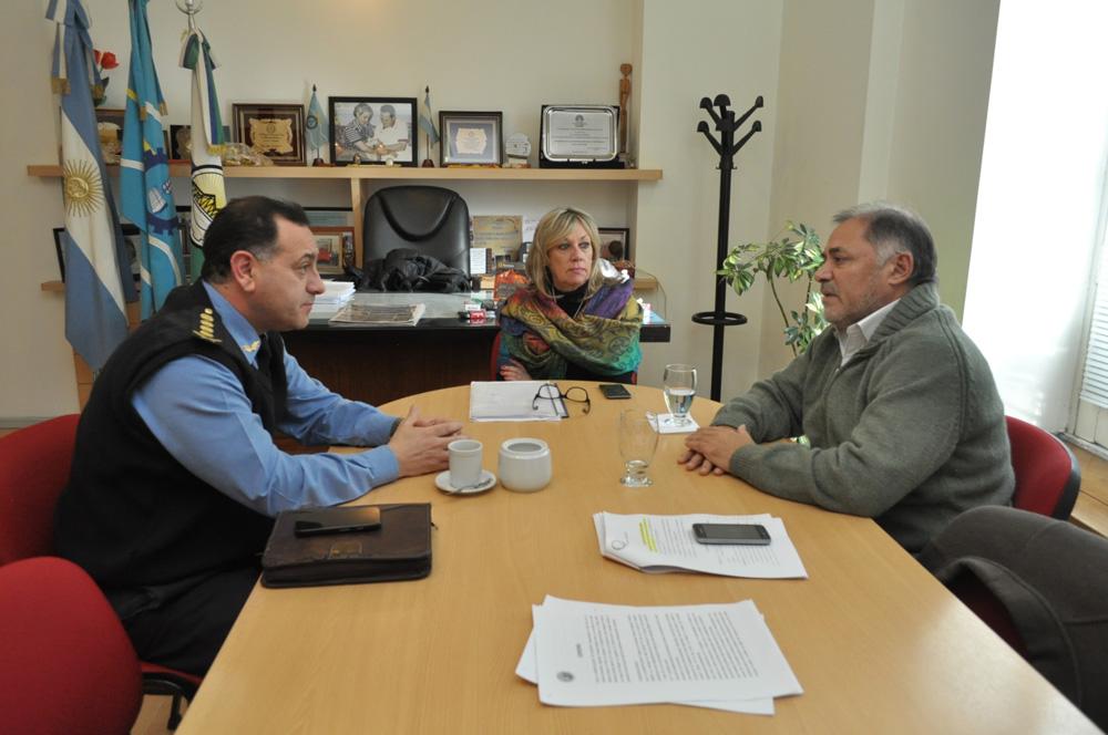 La intendenta Rossana Artero, junto al secretario de Gobierno y Coordinación de Gabinete, Jorge Aleua, recibió al jefe de la Policía del Chubut, Luis Avilés, para analizar sobre la seguridad en Rawson y el avance del proyecto de construcción del Complejo Educativo Policial que estará ubicado en el ingreso al exzoológico.